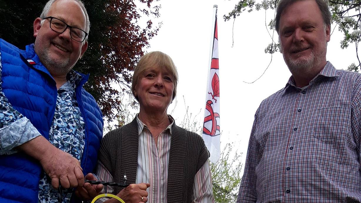 Christian Voigt (v.l.), Burkhard Scheiding und Sabine Detzmeier vom Gartenbauverein. Hinten hängt die Fahne von Südlengern, Christian Voigt hat ein schmiedeeisernes Vereinslogo angefertigt. | © Meiko Haselhorst