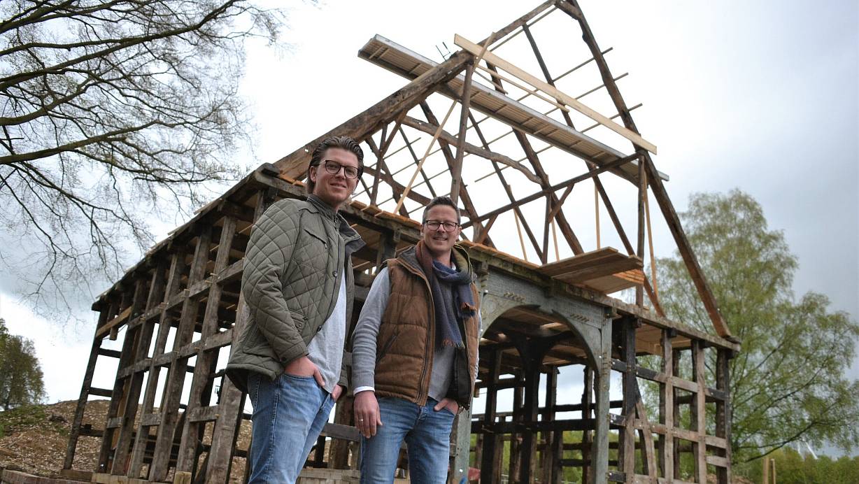 Jan (l.) und Christoph Nobbe vor dem "neuen" Fachwerkhaus auf ihrem Grundstück. Ende des Jahres muss es fertig sein, dann läuft die Förderung aus. | © Meiko Haselhorst