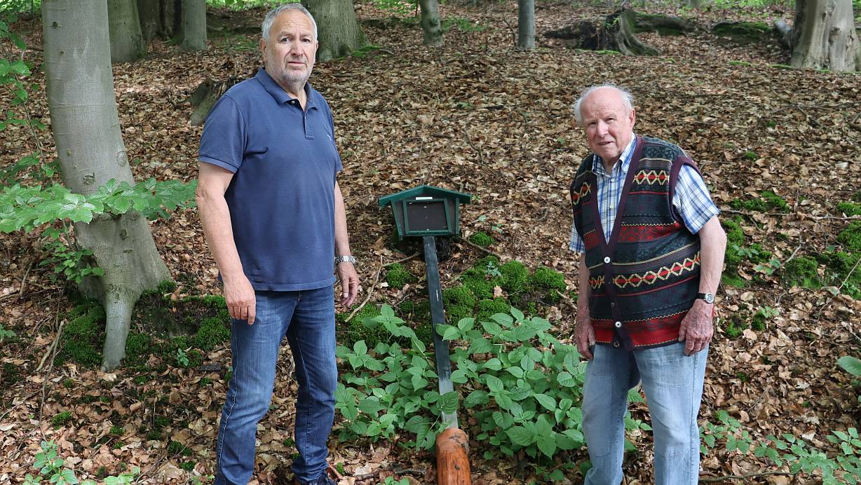 Eine von vielen Beschädigungen: Hans Dieter Mickmack (l.) und Hans-Hermann Sasse neben dem herausgerissenen Pfahl. Sie sind entsetzt über die mutwilligen Zerstörungen am Lehrpfad. | © Shannon-Lee Bendig
