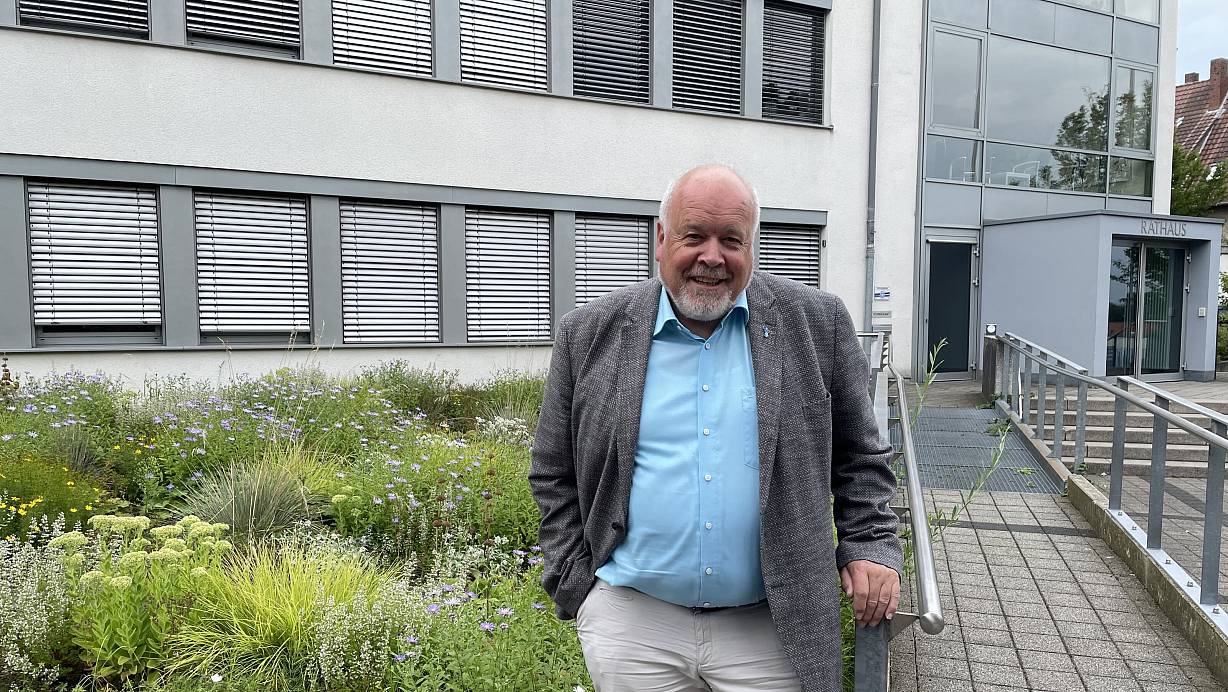 Mit fast 20 Jahren Dienstzeit ist Rüdiger Meier der dienstälteste Bürgermeister im Kreis Herford. Hier steht er vor dem Rathaus, vor dem es in großen Beeten summt. Insektenfreundliche Bepflanzung sei ein Beitrag der Gemeinde zum Klimaschutz, sagt Meier. | © Natalie Gottwald