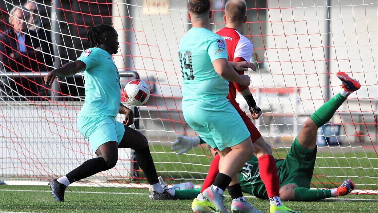 Kein Tor für den FCO: RWK-Torwart Finn-Luis Patzek klärte vor Dominik Moskvin (19) und Gerhard Kwarteng (l.). | © Egon Bieber
