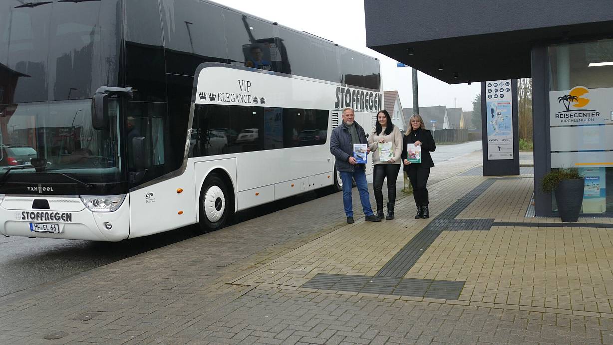 Der topmoderne Reisebus ist frisch gewaschen: Dirk Kösting (v.l.) Jeanette Schunke und Tina Dröge am Reisecenter Kirchlengern. | © Thorsten Mailänder