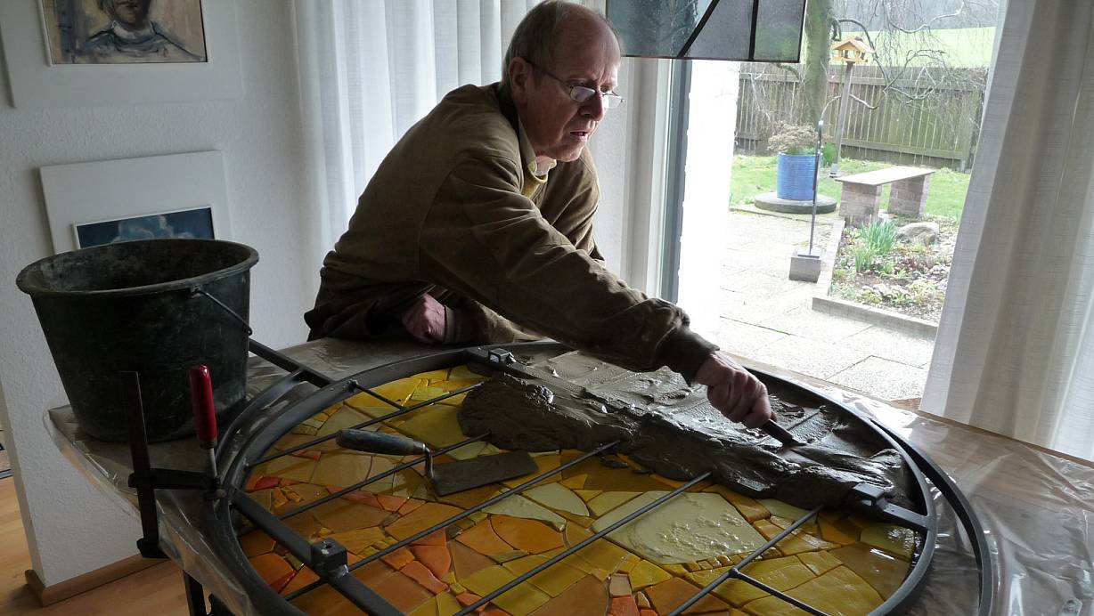 Bei der Arbeit: Horst Bohatschek 2010 in seinem Atelier im Erdgeschoss des Hauses. Er arbeitet mit Mörtel an einem Wandmosaik. Die Fotos hat sein Sohn zur Verfügung gestellt. | © FOTO: FALK BOHATSCHEK