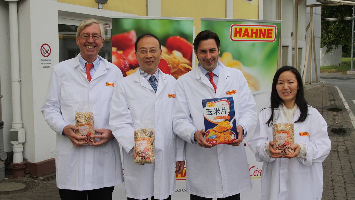 Vor dem Produktionsgebäude: Dietrich Hahne (v.l.), Jian Rong Shang, Nikolaus Hahne und Hao Jianxiu. | © Foto: Dirk Windmöller