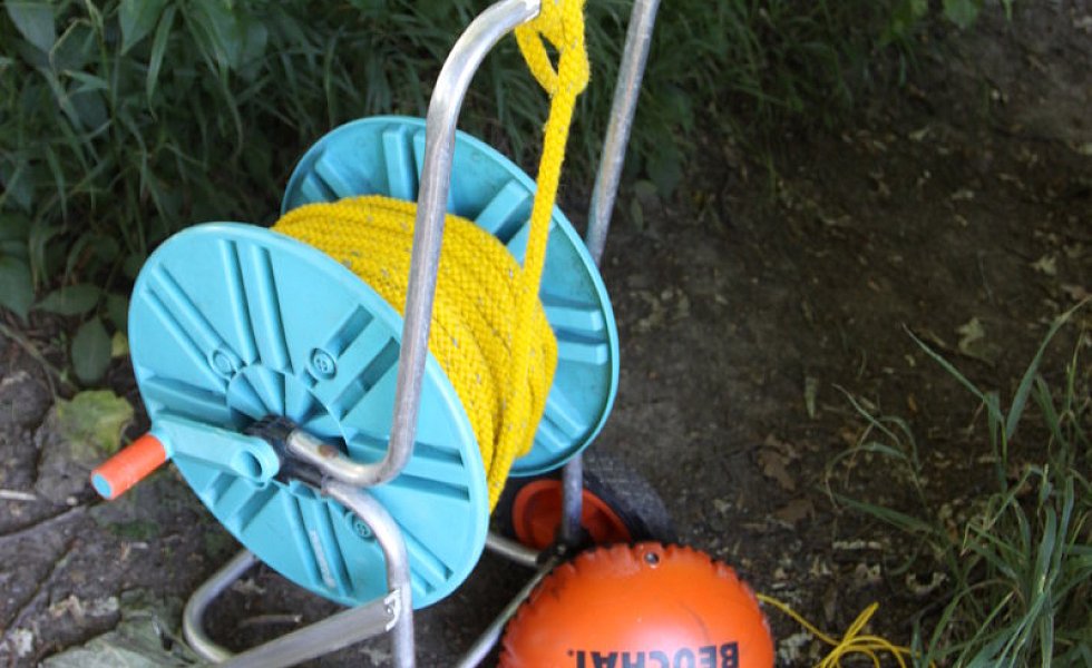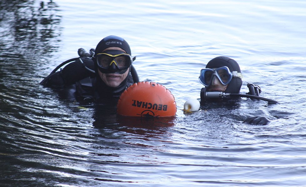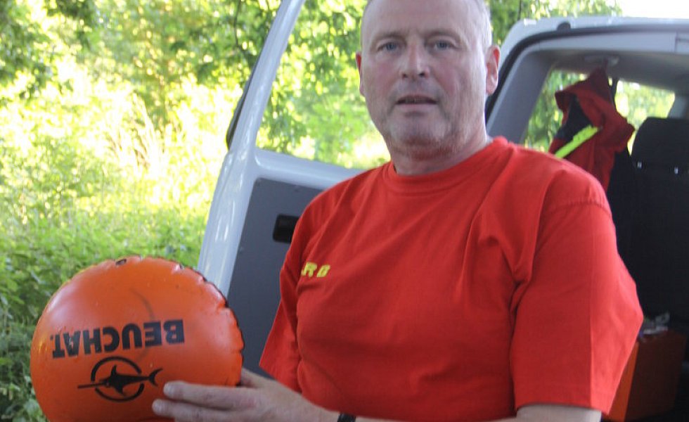Schnell haben sich Gerald Huse und Jochen Pahmeyer umgezogen und ihre Ausrüstung angelegt. Rolf Weidenbörner bleibt an Land und sichert die Taucher. Auch mit einem Seil, an dem Jochen Pahmeyer hängt. „Ohne mich kommt der nicht weit“, sagt Weidenbörner lächelnd. Am Seil hängen die Taucher der DLRG auch bei Einsätzen. „Die Sicherheit geht vor“, betont Weidenbörner. Mit dem Seil kann ein Taucher im Notfall zum Beispiel gezogen werden, wenn er unter Wasser an einer Wurzel oder einem Gegenstand hängen geblieben ist. Es dient auch der Signalgebung. Durch Züge am Seil können sich Signalmann Weidenbörner und Taucher Pahmeyer verständigen. Und so schnell klären, ob für den Taucher unter Wasser alles problemlos läuft. Und auch wenn die Werre oberflächlich betrachtet wie ein stehendes Gewässer wirkt, hat sie doch ihre Tücken. „In tieferen Bereichen ist die Strömung relativ stark“, sagt Pahmeyer, als er bei seiner Suche nach dem tiefsten Punkt kurz auftaucht. Gerald Huse ist unterdessen ebenfalls mit abgetaucht. Ohne Seil geht er nicht so tief runter, hat aber den entscheidenden Tipp. „Ich vermute, kurz hinter der Eiche ist es am tiefsten.“ Pahmeyer taucht ab und nach wenigen Minuten kommt die Bestätigung: „Stimmt, hier geht es bis auf 3,80 Meter runter.“ Mission erfüllt. Pahmeyer fixiert eine Boje für das Foto.