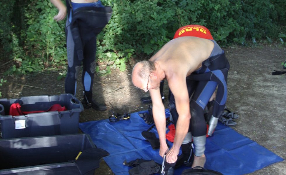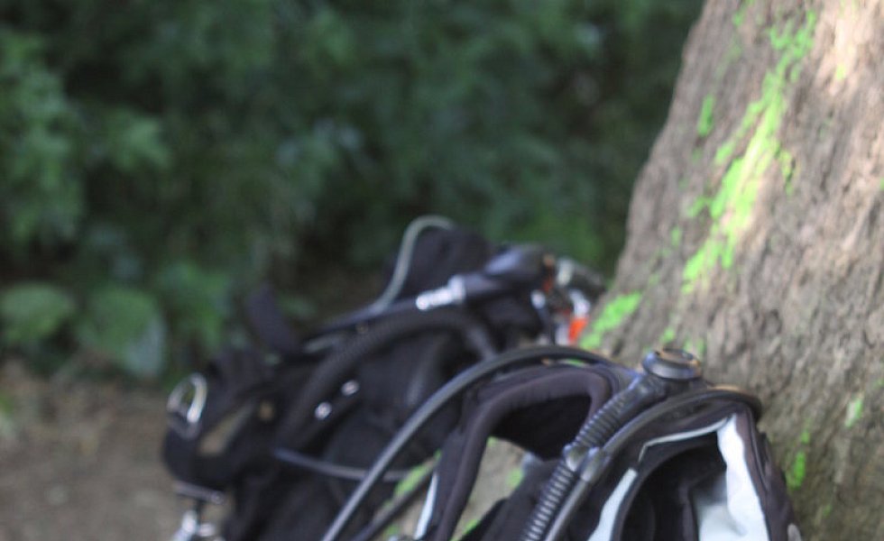 Für den Tauchgang in der Werre stellen sie ihre Ausrüstung zusammen: Neoprenanzüge, Atemgeräte, Jackets, Pressluftflaschen, Bleigewichte. Die Sachen werden im vereinseigenen Transporter verstaut und los geht es.