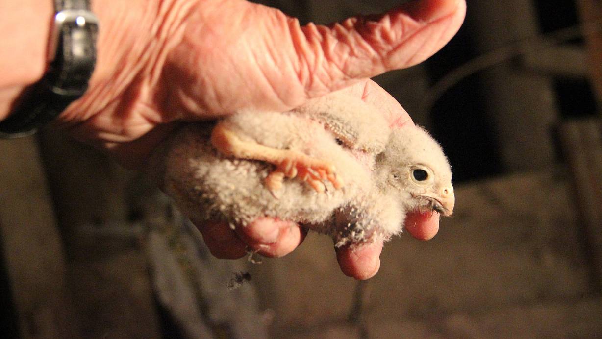 Frisch geschlüpft: Siegfried Harre hält ein Tier in den Händen. Trotz Kontakt mit dem Menschen, wird der Jungvogel von seinen Eltern wieder angenommen, da der Geruchssinn bei Vögeln deutlich schwächer ausgeprägt ist, als beim Säugetier. Deren Jungtiere darf man auf keinen Fall anfassen, da sie sonst von den Eltern verlassen werden. | © Siegfried Harre