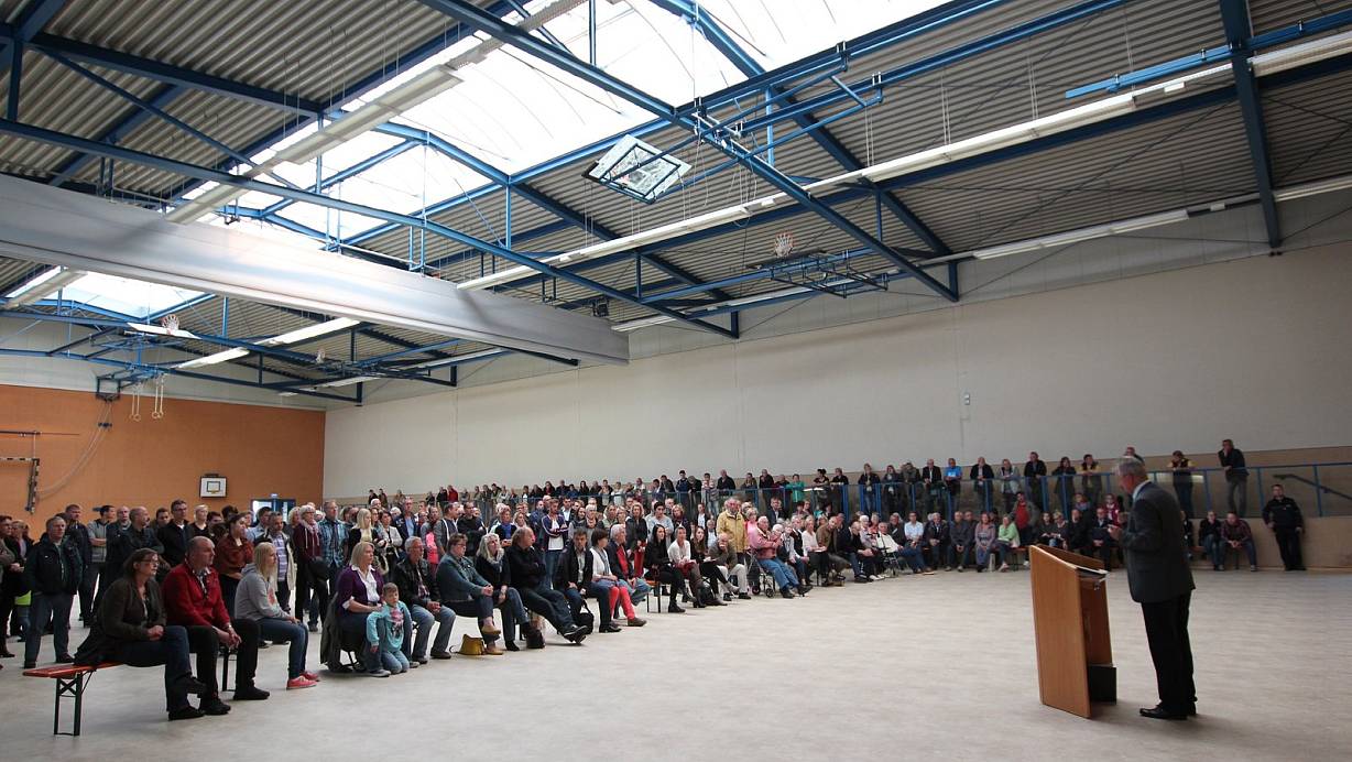 Bürgermeister Held beantwortete die Fragen der Bürger zu der geplanten Notunterkunft für Flüchtlinge. | © Kristine Greßhöner