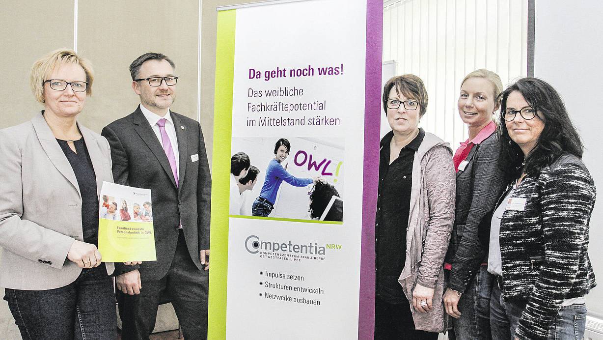 Sprechen über Vereinbarkeit zwischen Familie und Beruf: Meike Stühmeyer-Freese vom Kompetenzzentrum Frau und Beruf OWL (v. l.), Experte Patrick Frede, Marion Schwarze (Qualitätsmanagement Berolina-Klinik), Verena Linnenkamp und Petra Kixmöller-Süllwld (beide Gleichstellungs- und Migrationsbeauftragte in der Berolina-Klinik). | © Susanne Barth