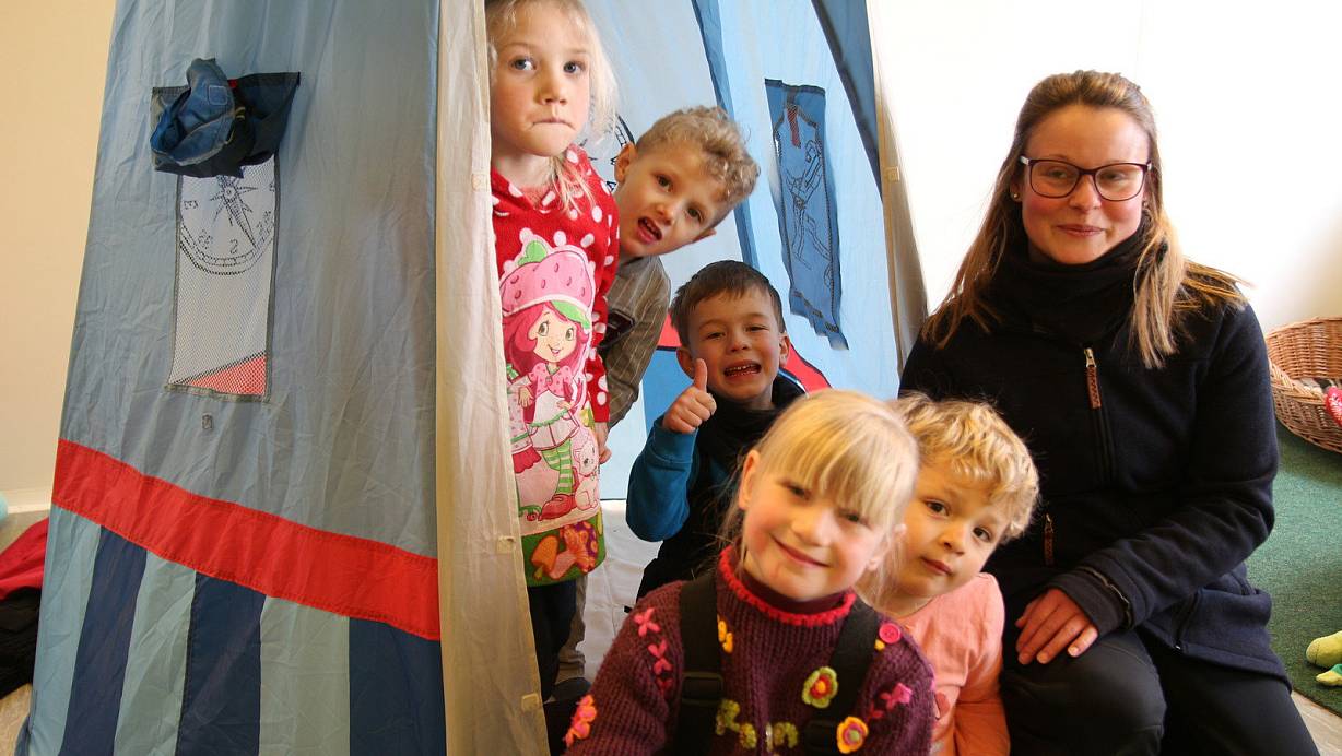 Umzug in die neue Wichtelstube: Mathilda (5, v. l.), Jayden (4), Felix (5), Finja (5), Yunnes (4) und die baldige Kindergartenleiterin Ricarda Kirchner freuen sich über das neue Zelt. | © Jemima Wittig