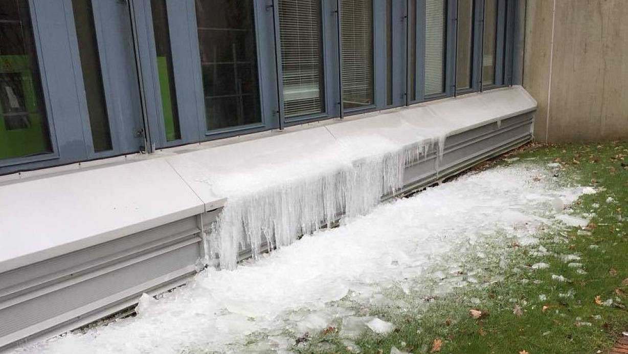 Eis an der Fassade: Ein Anwohner hatte diese ungewöhnlichen Eiszapfen Anfang bemerkt und den Hausmeister alarmiert. | © August-Griese-Berufskolleg
