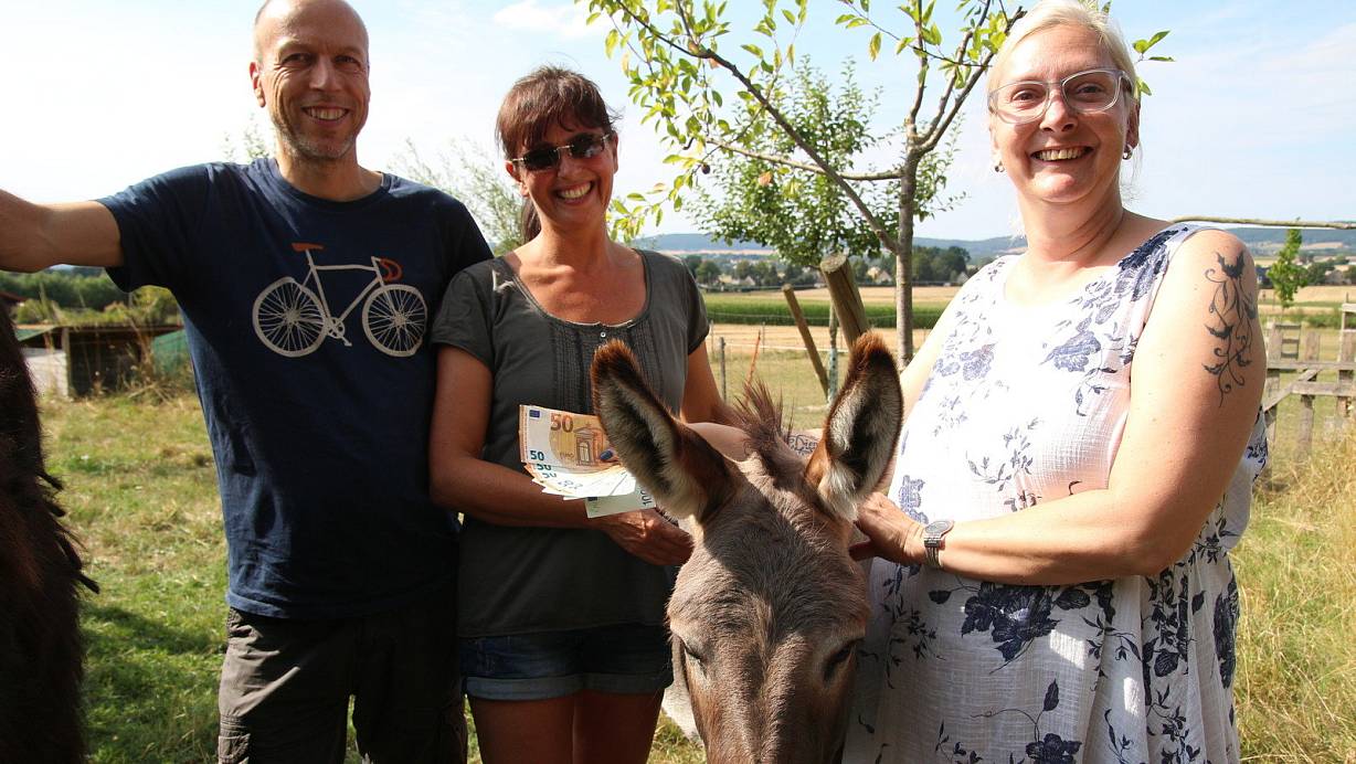 Stephanie und Claus-Martin Barthelheimer nehmen die Spende von Kirsten Beul, Inhaberin der Buchhandlung Dehne (r.) für den Lebenshof Lilly entgegen. | © Susanne Barth