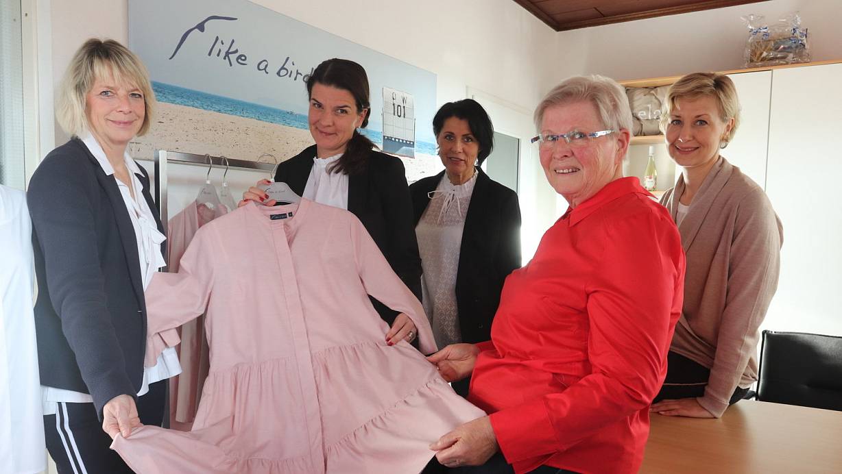 Das Team des Labels „like a bird“ mit einem Kleid aus der neusten Kollektion: Gabriele Kamswich (Vertrieb, v. l.), Tanja Kliewe-Meyer (Inhaberin und Kopf der Brand), Ulrike Niederkleine (Produktionsleiterin), Alessia Nagel (Designerin) und Antonette Sondergeld (Assistentin). Fotos: Susanne Barth | © Susanne Barth