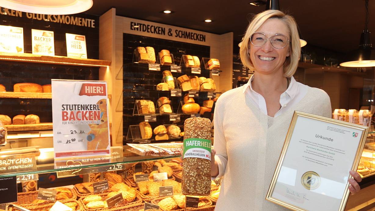 Ausgezeichnet: Simone Böhne hält ein Brot mit dem Namen „Haferheld“ in der Hand. Dafür wurde das Unternehmen mit dem Landesehrenpreis in Düsseldorf geehrt. Foto: Dirk Windmöller | © Dirk Windmöller