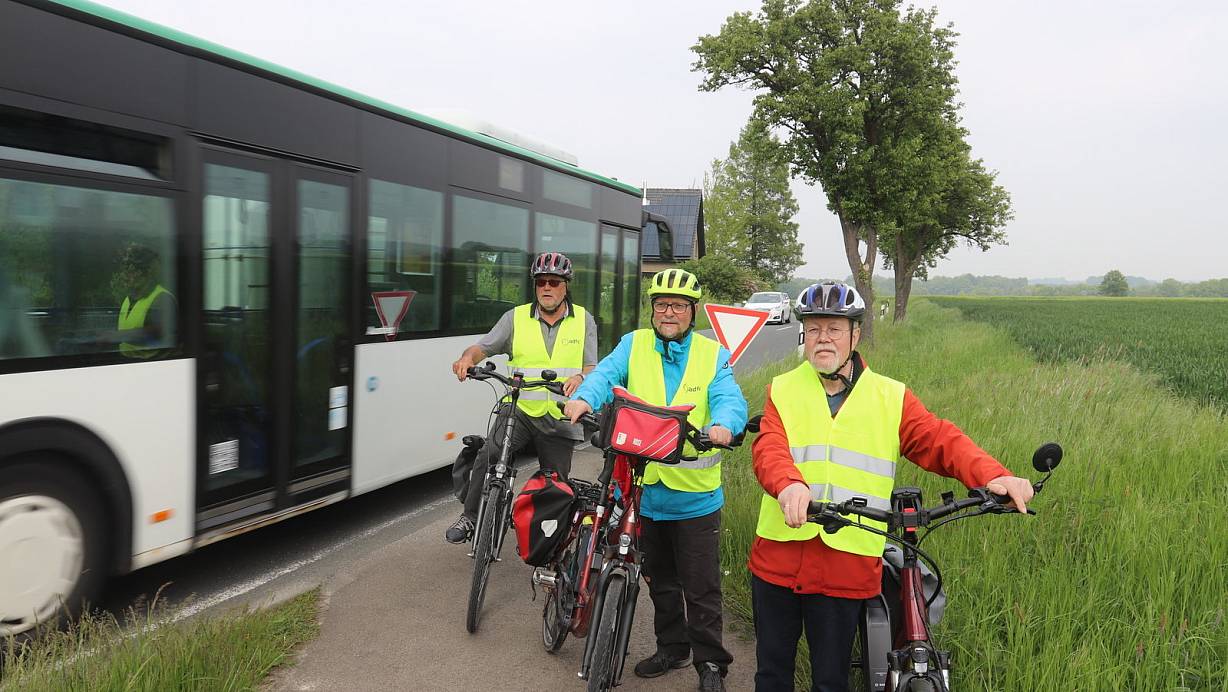 Hier endet der Radweg: Helmut Stickdorn (v.l.), Ulrich Flachmann und Jürgen Wehmeier stehen an der Häger Straße. Ab diesem Punkt müssen sie sich die Strecke in Richtung Koblenzer Straße mit Pkw, Lkw und Bussen teilen. | © Dirk Windmöller