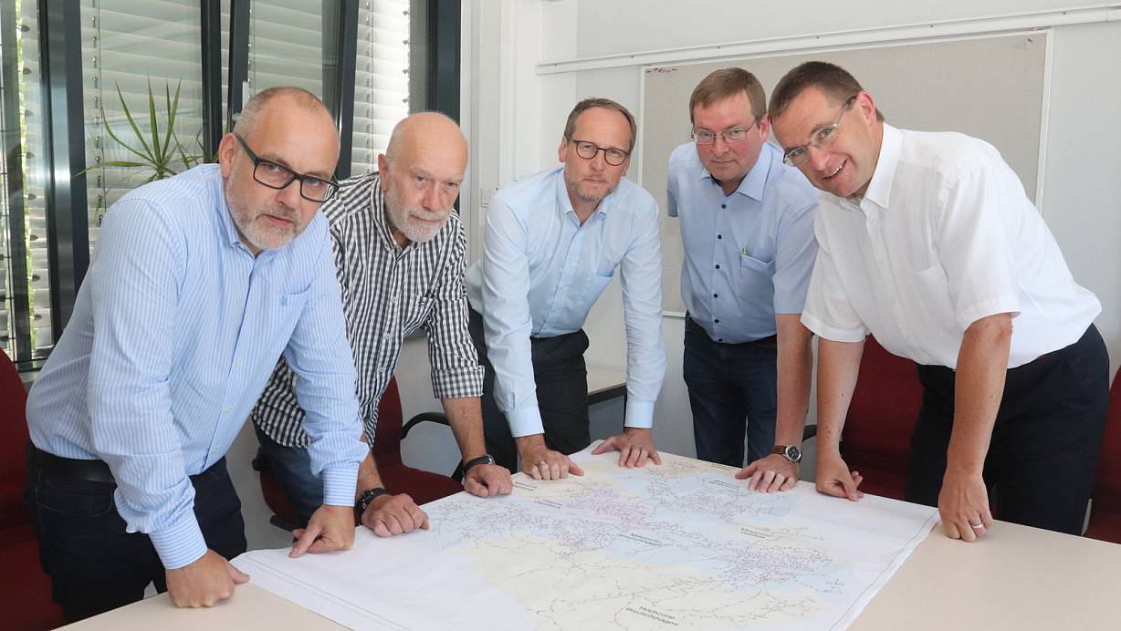 Haben einen Blick auf den Wasserverbrauch: Matthias Kreft und Klaus Wilmsmeier (Wirtschaftsbetriebe Löhne), Bernd Poggemöller (Vorsteher des WBV), Andreas Schwarze (Vorstand der Stadtwerke Bad Oeynhausen) und Stefan Wiese (technischer Betriebsleiter des WBV). | © Dirk Windmöller