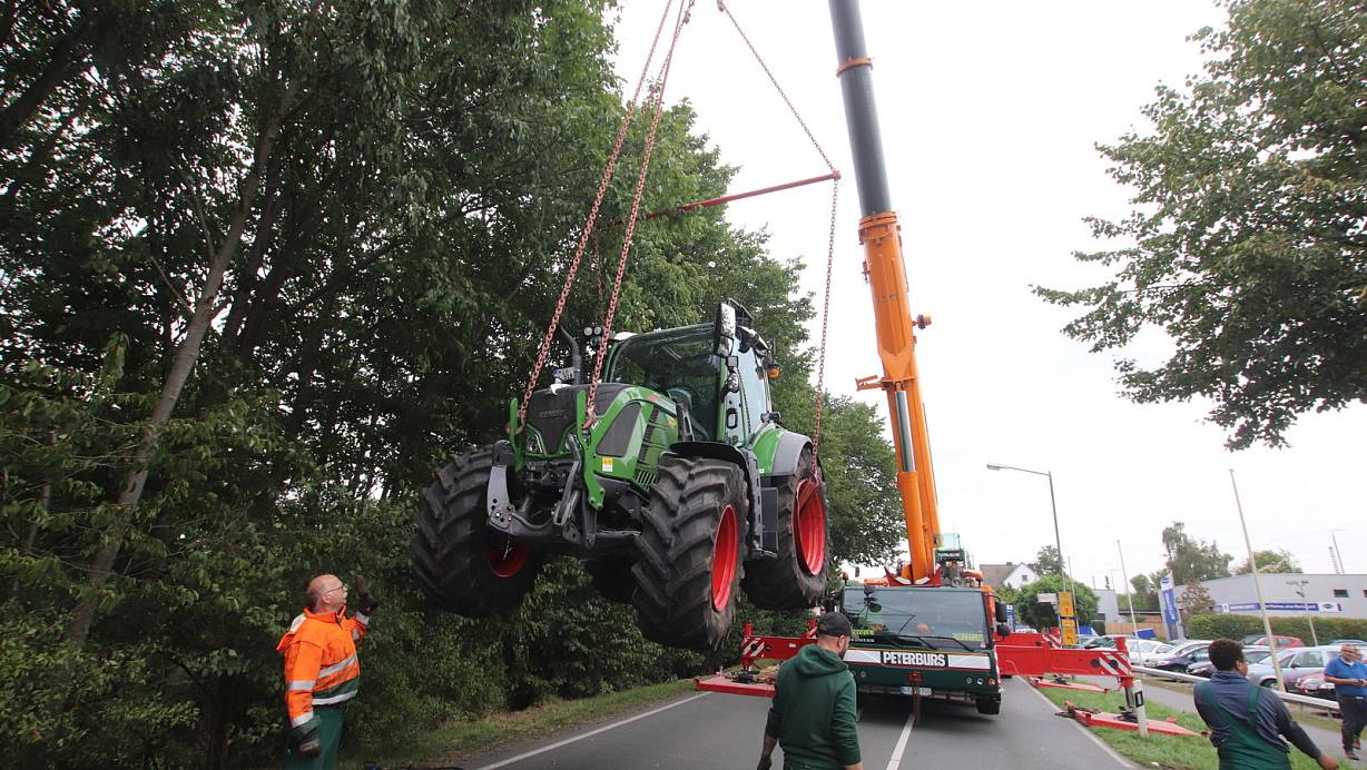 Schlepper und Auflieger sind einen sieben Meter tiefen Abhang herunter gestürzt. Der Fahrer aus Bad Oeynhausen ist schwer verletzt. Die Bünder Straße war gesperrt, ist mittlerweile wieder offen.