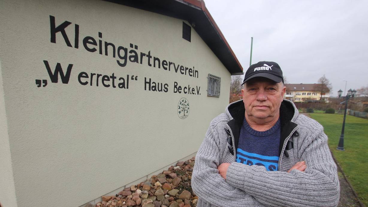 Rainer Scholt (65), Vorsitzender des Kleingartenvereins "Werretal" vor dem Vereinsheim. Der Einbrecher scheiterte an der Tür zum Vereinshaus, richtete aber erhebliche Schäden an. | © Ulf Hanke