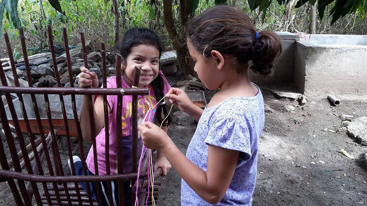 Zwei Mädchen flechten Freundschaftsbänder im Innenhof des INPRHU-Straßenkinderprojekts in Condega. | © Gina Gröppel