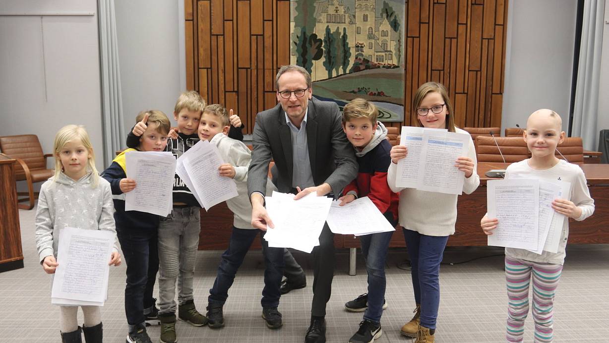 Die Kinder übergaben Bürgermeister Bernd Poggemöller 444 Unterschriften im großen Saal des Rathauses. | © Dirk Windmöller