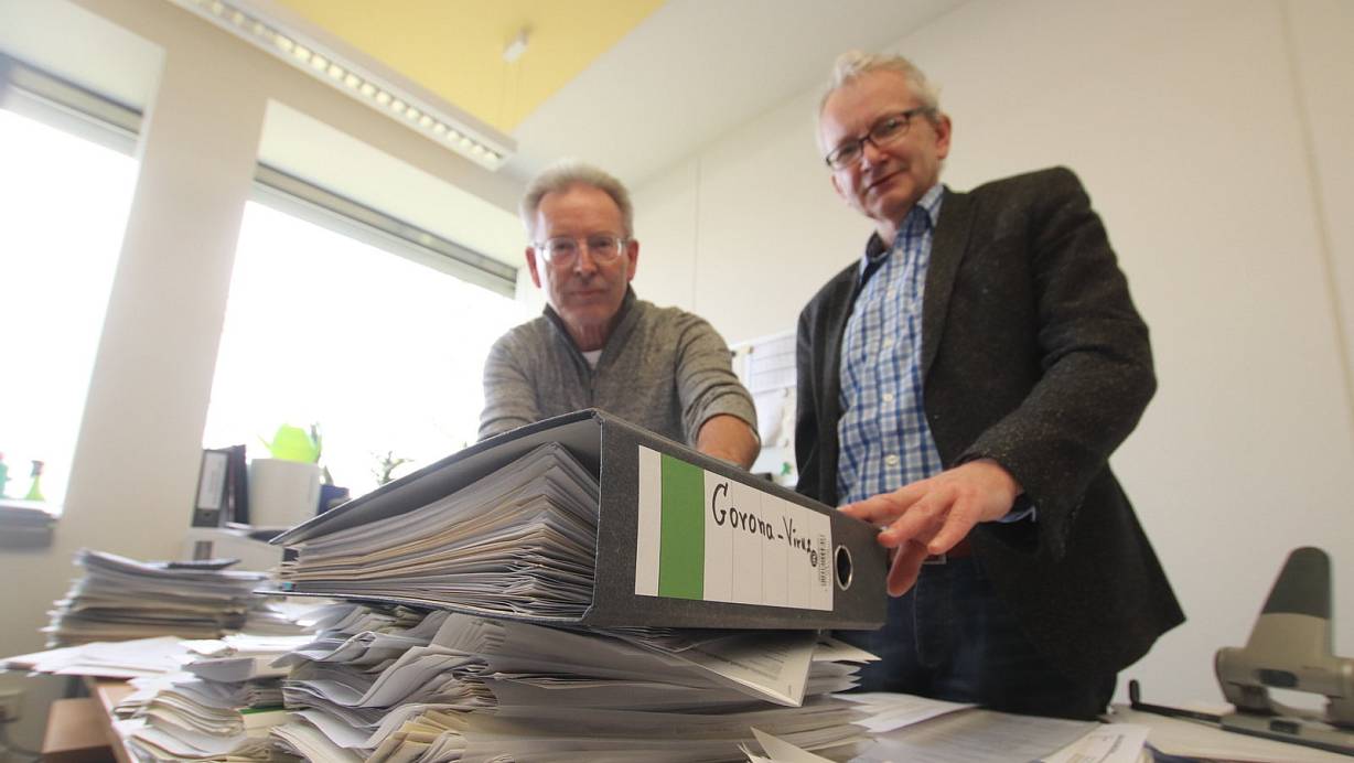 Die Akte Corona: Paul Urban (l.) und Ulrich Niemeyer von der Stadtverwaltung und vom Löhner Krisenstab erläutern die Liste der abgesagten Veranstaltungen in Löhne. | © Ulf Hanke