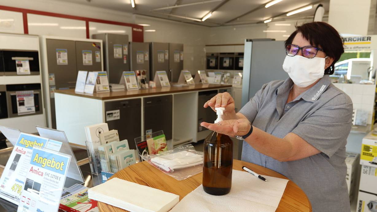 Mit Masken, Desinfektionsmittel und Spuckschutz ist der Handel vorbereitet. Mehr als 300 Geschäfte dürfen öffnen, nur zwei bleiben dicht.