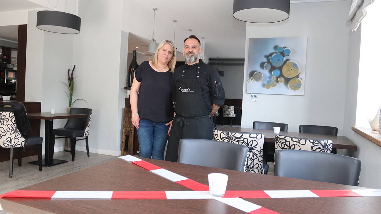 Marco und Tanja Lignante stehen im Restaurant Lignantes vor einem abgesperrten Tisch. Hier darf zu Corona-Zeiten niemand sitzen. Denn auch im Restaurant gilt: 1,5 Meter Abstand. | © Dirk Windmöller