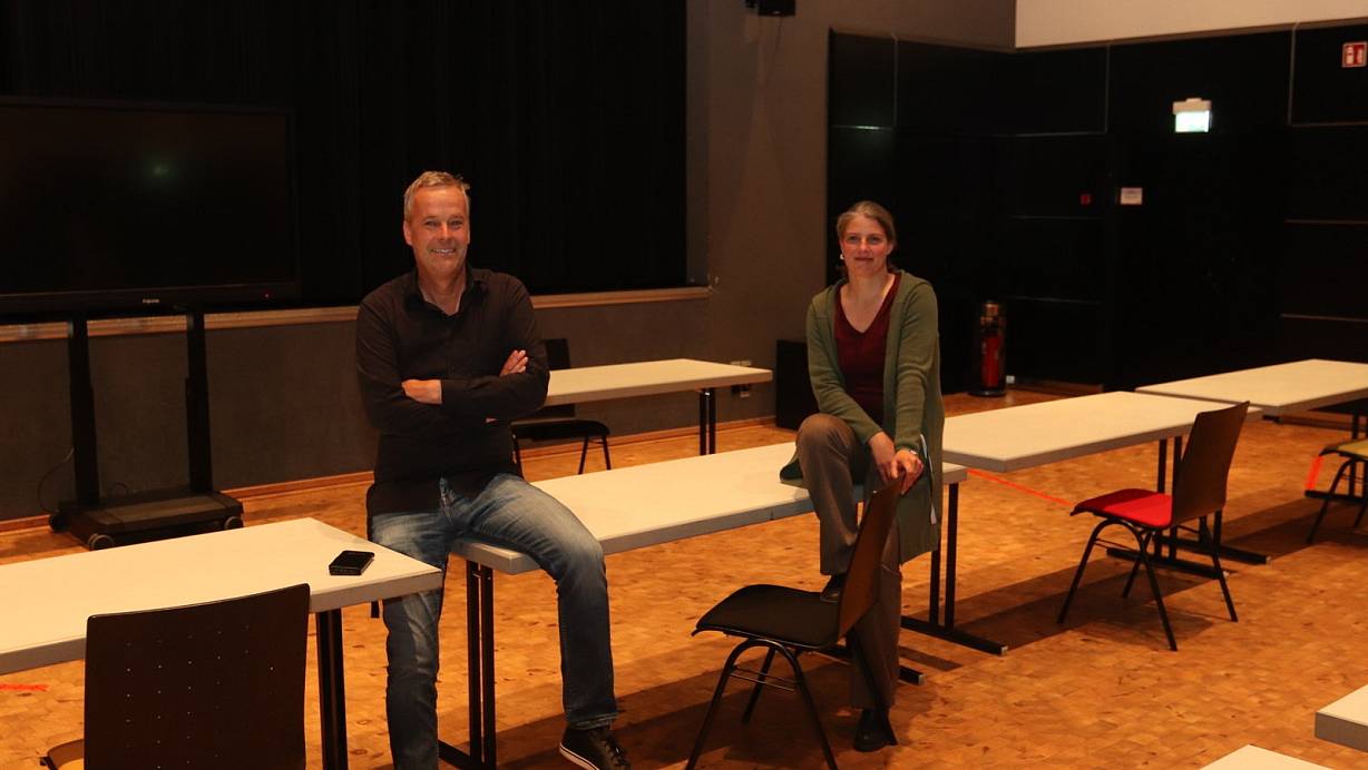 Dirk Hinke und Maren Doehmen im Saal 2 der Werretalhalle. Hier wird aktuell Deutsch gepaukt, statt mit Comedians zu lachen. | © Dirk Windmöller