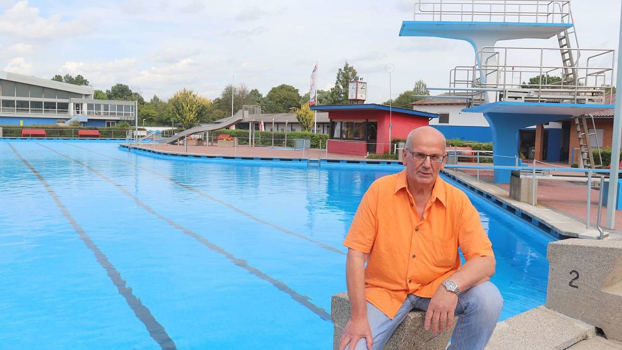 Burkhard Schröder, Vorsitzender des SC Aquarius, sitzt auf einem Startblock im Freibad. Er hofft, dass es am Dienstag grünes Licht für die Öffnung gibt. Das Foto entstand im September 2019. | © Dirk Windmöller