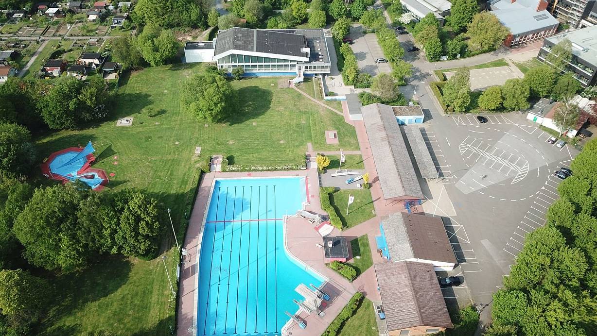 Luftild: Das Foto zeigt das Freibad vor dem Saisonstart. Das große Becken dominiert die Fläche. Links im Bild ist das Kinderbecken zu sehen. | © Wolfhard Jording
