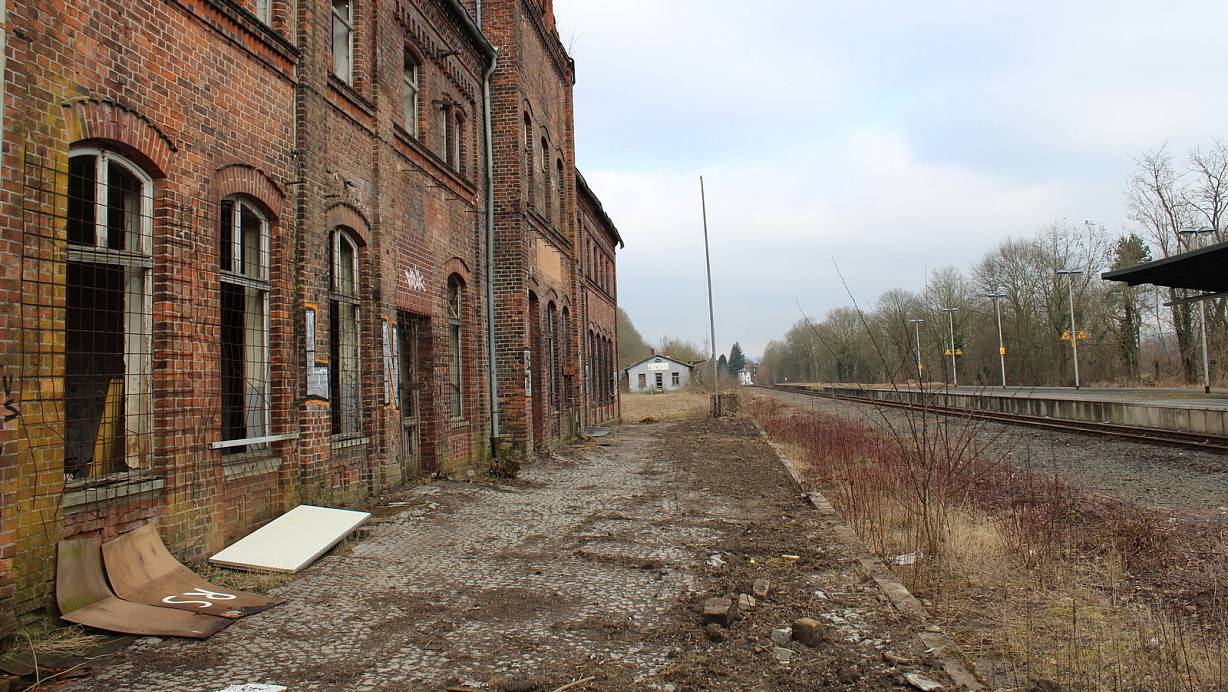 Hinteransicht des Bahnhofs Vlotho. Karlchens Backstube hat das zerfallene Gebäude gekauft. | © Anastasia von Fugler