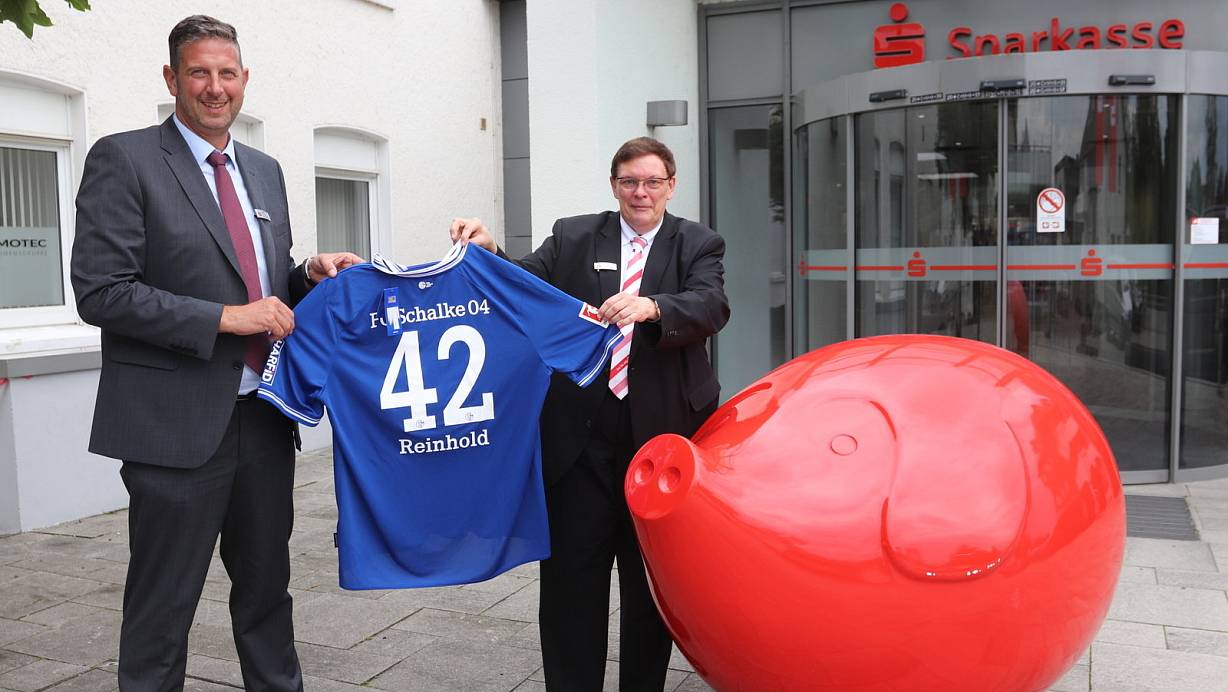 Zum Abschied bekam Reinhold Knebel (r.) ein Trikot mit der Nummer 42 geschenkt. So viele Jahre war er bei der Sparkasse. Es wurde ihm von Filialleiter Jürgen Flink überreicht. | © Dirk Windmöller