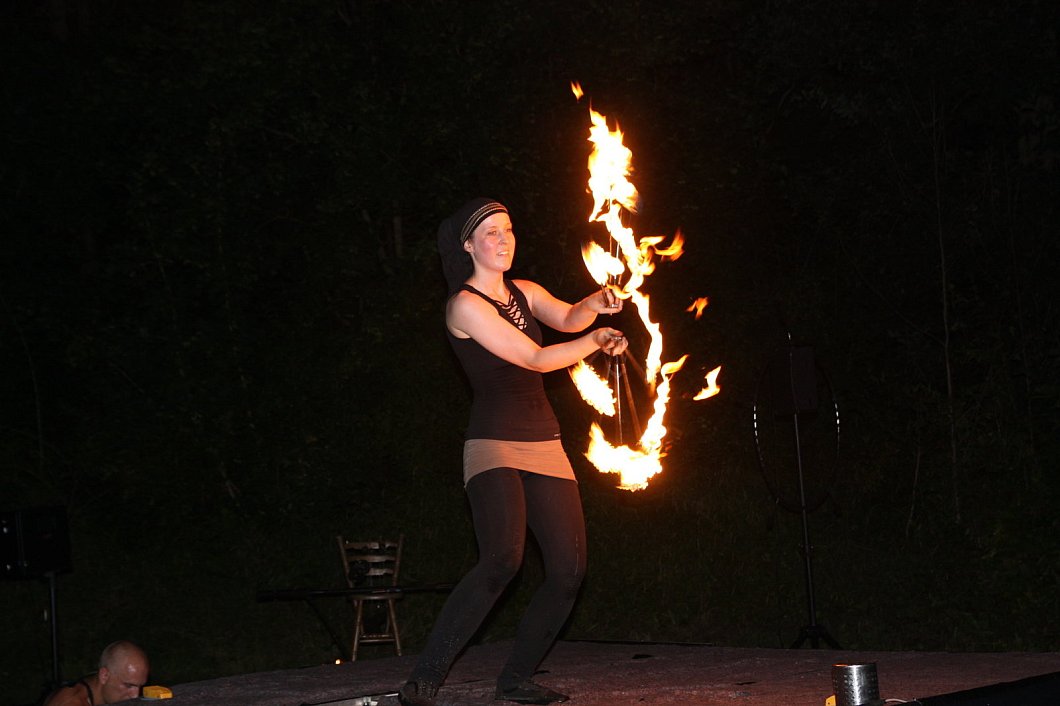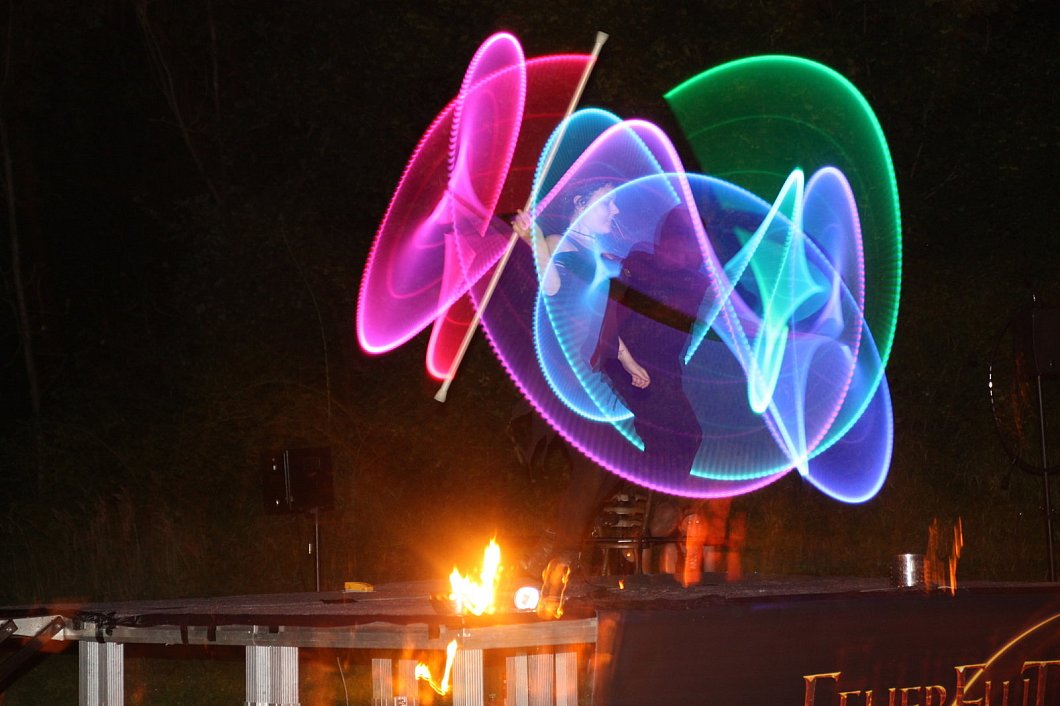 Und die Zuschauer kommen am vergangenen Freitag auf ihre Kosten. Einen "Querschnitt aus sieben Jahren Feuerflut" gibt es zu sehen, wie Jens Schwarze wissen lässt. Und der hat es in sich. Michelle Goeffroy lässt einen zum Teil brennenden Reifen um ihre Hüfte kreisen, dann lassen die beiden Feuerkünstler die Flammen direkt über ihre Haut gleiten, Jens Schwarze wirft seine brennenden Utensilien meterhoch in die Luft.