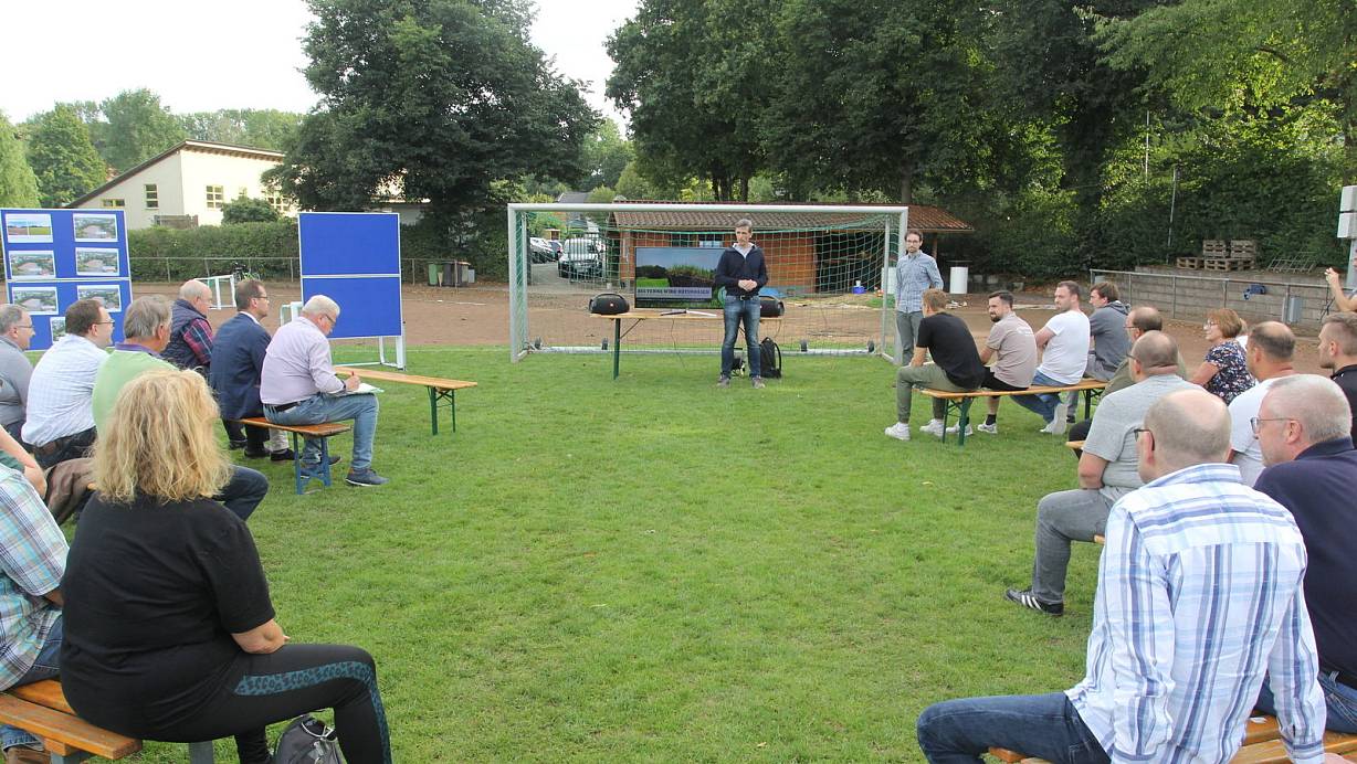Klaus Poppensieker (l.) und Patrick Schirrmacher vom Vorstand des Fußballclubs Löhne-Gohfeld stellen die Idee zum Umbau des Melbergener Ascheplatzes im Mittelbachstadion vor. Etwa 20 Interessierte sind gekommen | © Ulf Hanke