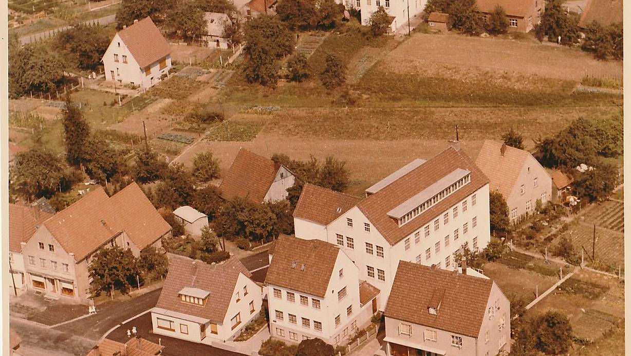 Das Luftbild zeigt die Gebäude der Firma Dreyer in den 1960er Jahren. Die Lübbecker Straße verläuft vor dem Komplex. Die Straße, die links abzweigt, ist der Kantor-Lohmann-Weg. | © Dirk Windmöller