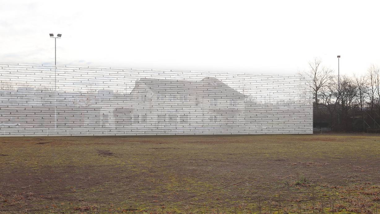 Unser Foto zeigt den ehemaligen Sportplatz und im Hintergrund das Brückenhaus. Zwischen Sportplatz und Gebäude haben wir eine Mauer montiert. Sie könnte dort aus Lärmschutzgründen verlaufen. | © Felix Eisele