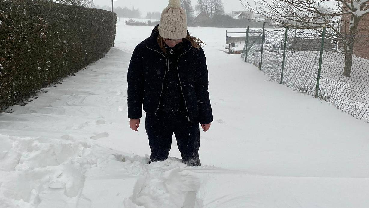 NW-Mitarbeiterin Anthea Moschner versinkt vor der Haustür bis zum Knie im Schnee. | © Moschner