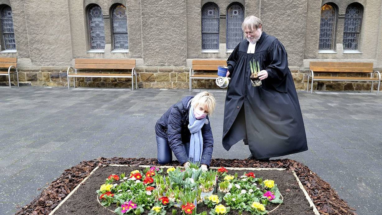 Blühende Osterbotschaft: Presbyterin Angela Wehmeyer und Pfarrer Uwe Petz bepflanzen das Osterbeet im Obernbecker Kirchhof. | © Sandra C. Siegemund