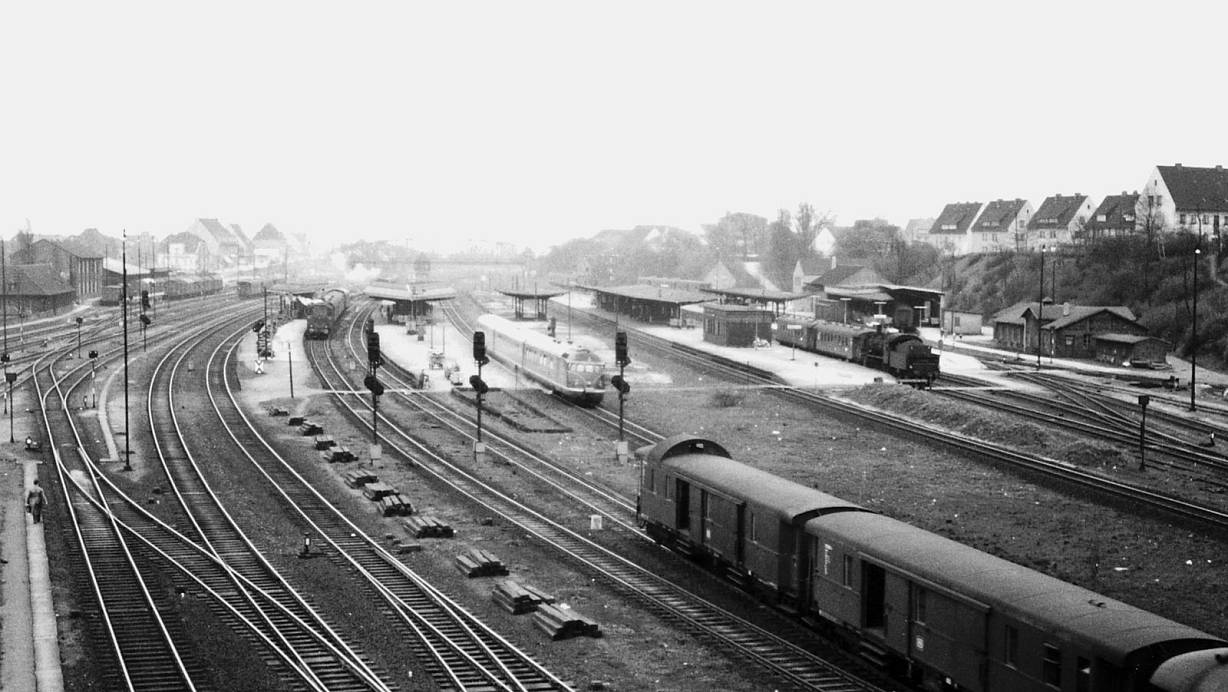 Der Löhner Bahnhof und der Personenbahnhof vom Stellwerk aus gesehen, Aufnahme von 1958/59. | © Stadtarchiv Löhne
