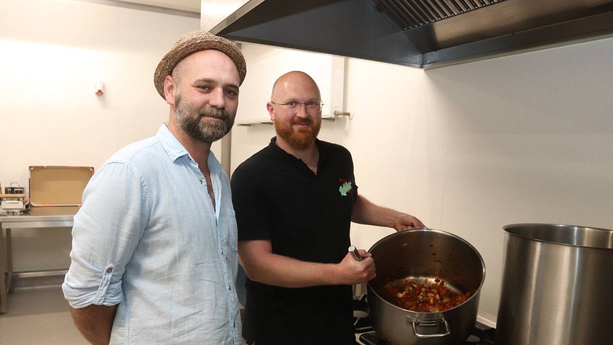 Alexander (li.) und Juri Krekker in der Küche des Unternehmens. Dort bereitet Juri Krekker die Sauce vor. | © Dirk Windmöller