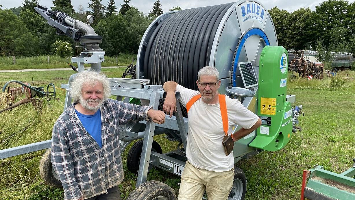 Wolfgang Nemesch (li.) und Guntram Sauermann stehen an einer Bewässerungsanlage, die die Biogärtner zum wässern des Gemüses brauchen. | © Dirk Windmöller