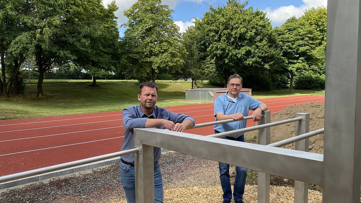Carsten Hohlt (li.) und Thomas Jöstingmeier an der Calesthenics-Anlage. | © Dirk Windmöller