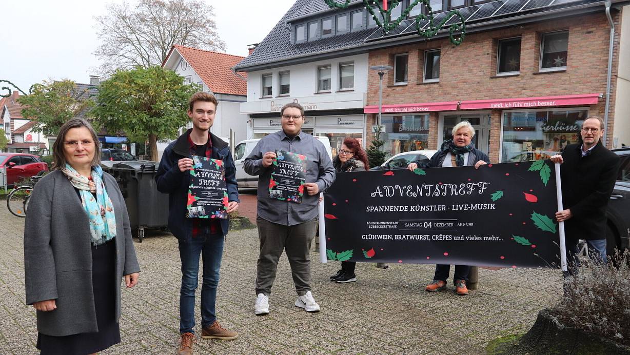 Britta Lehmann (v. l.), Tim Köhler, Florian Herda, Margit Bierbüsse, Guido Röhr und Bürgermeister Bernd Poggemöller zeigen Banner und Poster für den Adventstreff. | © Judith Gladow