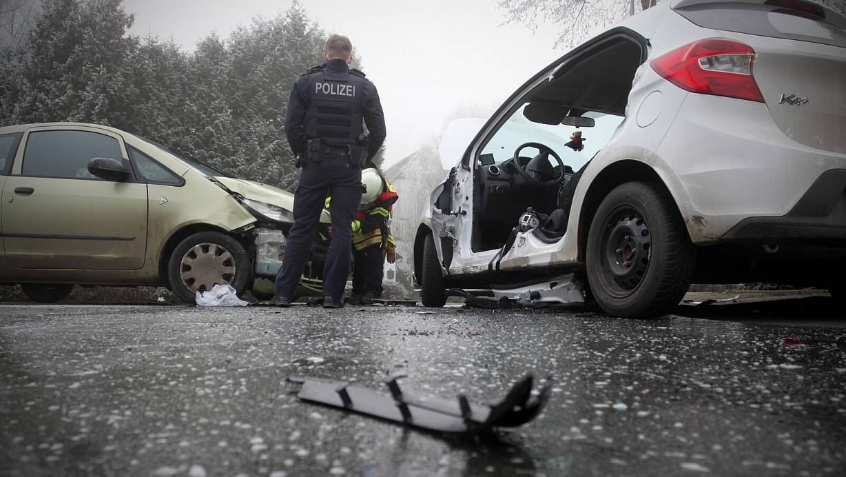 Auf der Brunnenstraße ist es zu einem Verkehrsunfall gekommen. Feuerwehr und Rettungsdienst helfen einer verletzten Frau aus ihrem Auto.