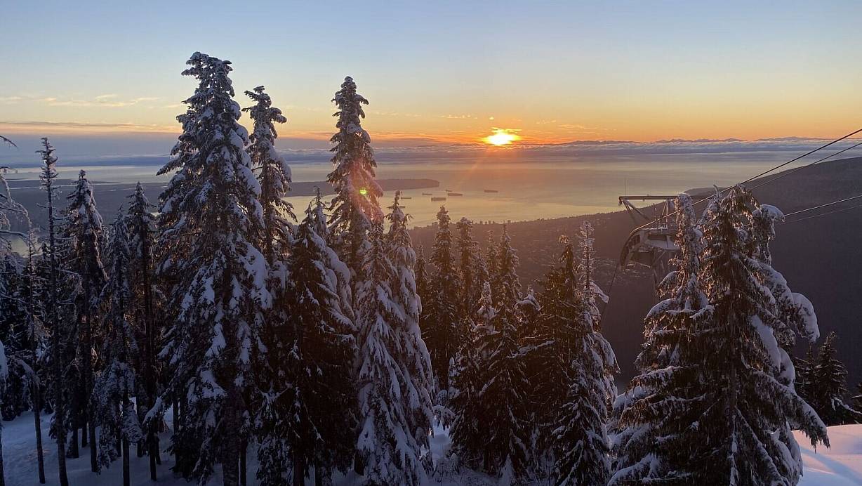 Schneelandschaft mit Aussicht: Oben auf Grouse Mountain, einem Berg in Nord Vancouver, können Besucher neben Skifahren und Schlittschuhlaufen auch den Ausblick über verschneite Tannen, die Stadt und das Meer genießen. Beim Sonnenuntergang über den Wolken verwandelt sich das Skigebiet in ein Winter Wunderland aus dem Bilderbuch. | © Lara Hus