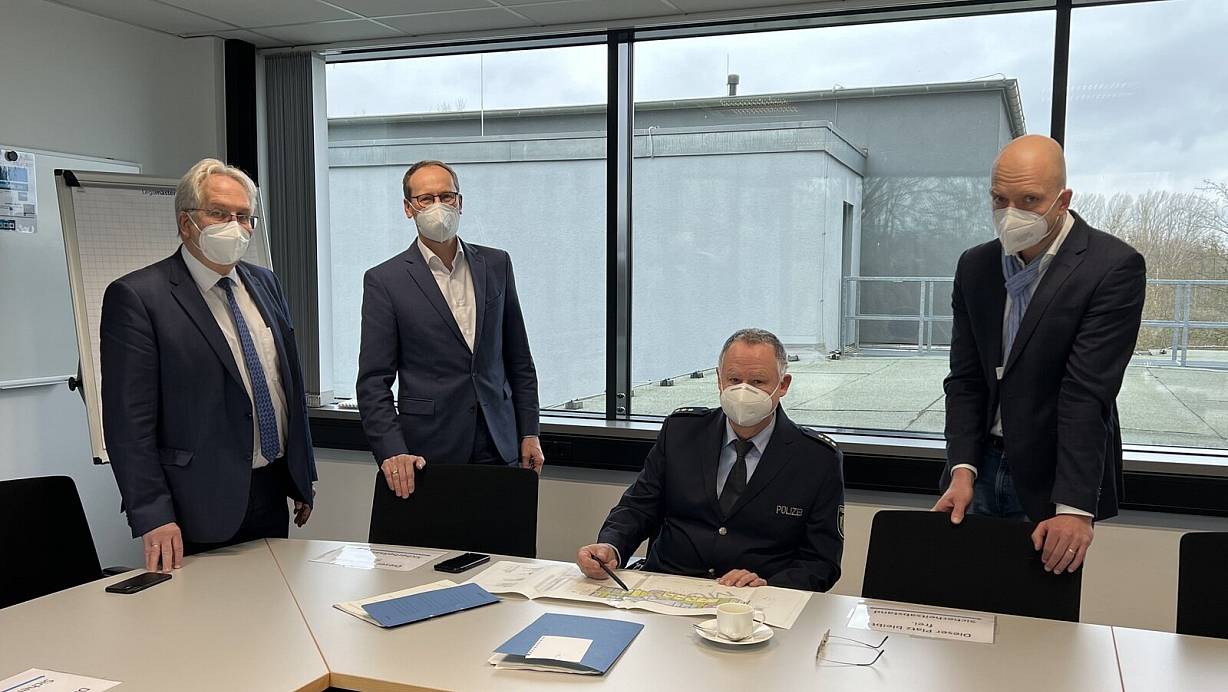 Landrat Jürgen Müller (v.l.), Bürgermeister Bernd Poggemöller, Polizeidirektor Andreas Brings und SPD-Landtagskandidat Christian Obrok sprachen über die Zukunft der Polizeiwache. | © Dirk Windmöller