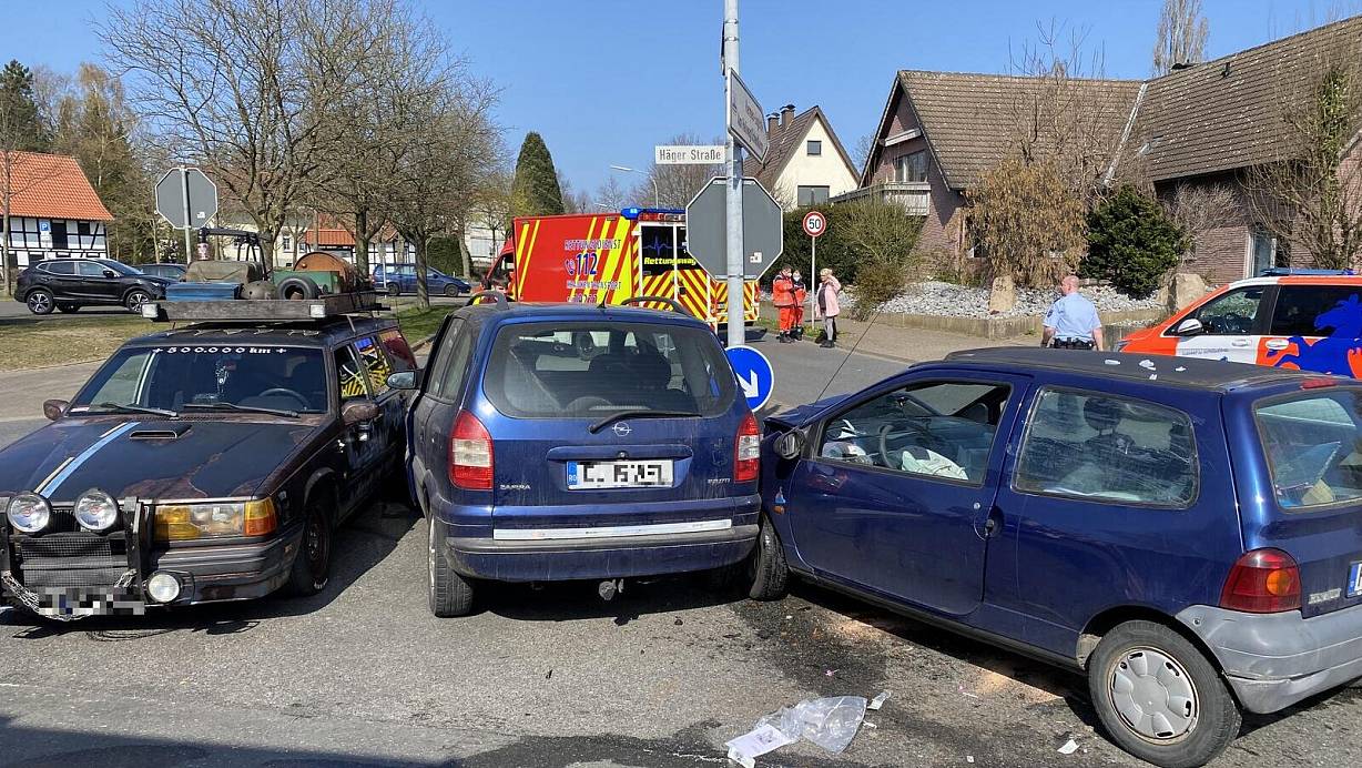 Drei Pkw waren an dem Unfall im Einmündungsbereich des Alten Postwegs zur Häger Straße beteiligt. Zwei Personen wurden dabei verletzt.