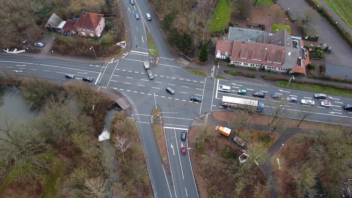 Das Becker Kreuz wird umgebaut. Das Luftbild zeigt die aktuelle Situation. Die Werster Straße im oberen Bildrand und die Lübbecker Straße, die durch Bildmitte verläuft, sollen eine weitere Spur erhalten. | © Wolfhard Jording