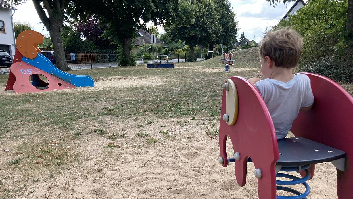 Der östliche Teil des Spielplatzes ist für Kleinkinder ausgelegt, hinter dem Hügel gibt es Angebote für Ältere. Die karge Rasenfläche hat aber auf dem gesamten Gelände schon bessere Zeiten gesehen. | © Felix Eisele