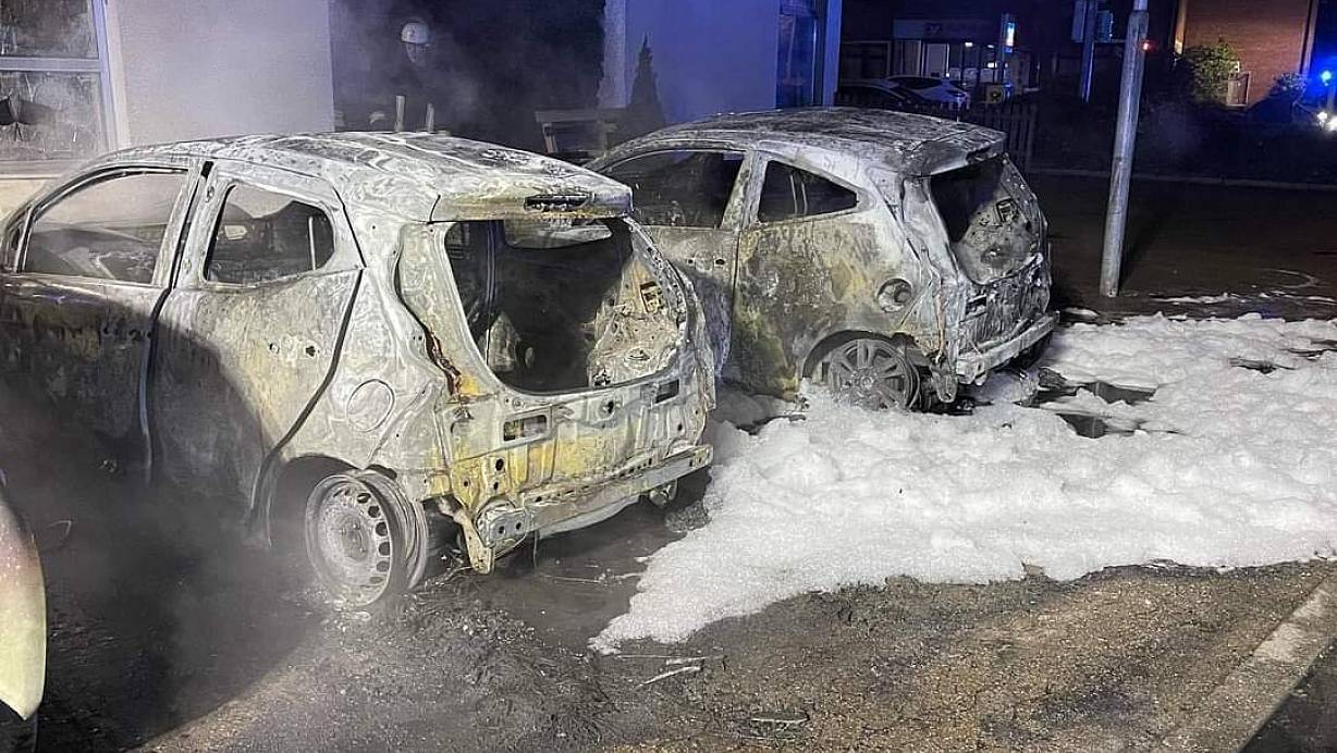 Zwei der Lieferwagen der Pizzeria brannten komplett aus. Das dritte Auto, das daneben stand, wurde ebenfalls vom Feuer befallen. | © Feuerwehr Löhne